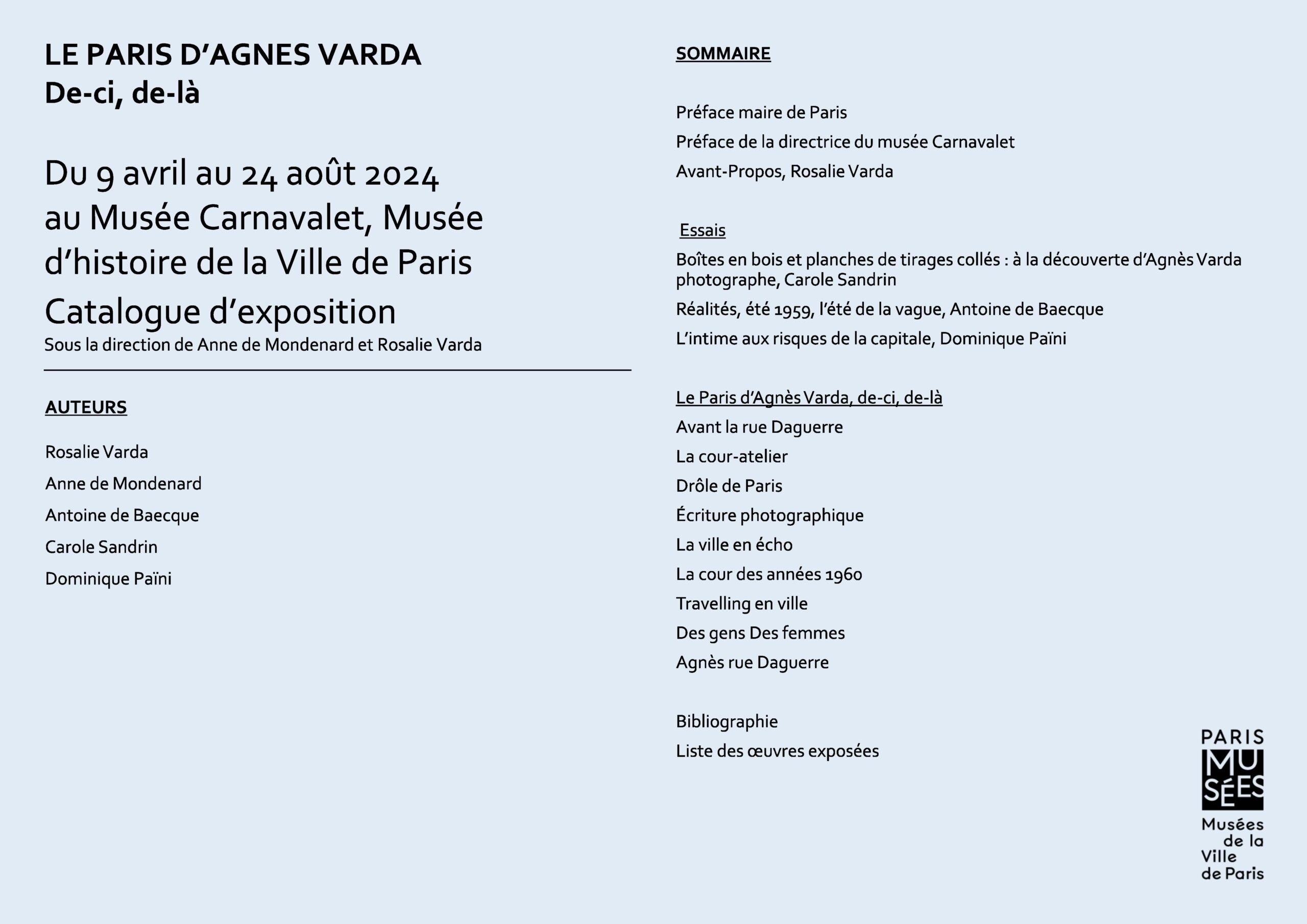 Elle présente également des publications, des documents, des objets ayant appartenu à l’artiste, des affiches, des photographies de tournage ainsi qu’une sculpture de sa chatte Nini ; commissariat général de Valérie Guillaume, commissariat scientifique de Anne de Mondenard et comité scientifique composé de Antoine de Baecque, Dominique Païni, Carole Sandrin et Rosalie Varda, photos en n.b. et en couleurs.