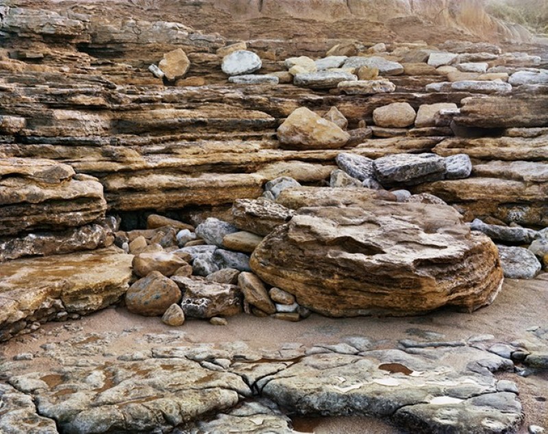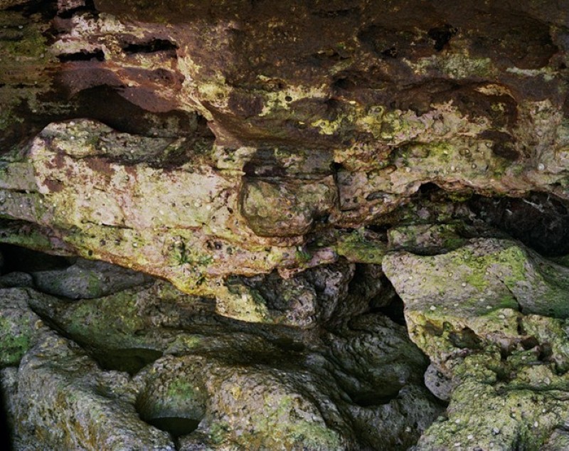 Le répertoire de formes ainsi produit renvoie à une pratique déjà amplement présente chez les pionniers de la photographie de la fin du XIXe siècle — typologies, herbiers ou inventaires — qui visait souvent autant à documenter la nature qu’à la domestiquer. Si le rocambolesque des expéditions est estompé par le progrès des moyens de locomotion, le matériel photographique imposant qu’elle utilise aujourd’hui encore s’en approche. À la chambre photographique, c’est avec la même obsession du détail, la réfraction des couleurs ou encore le bruissement des lumières qu’elle tente de renouer. Ce qui se joue dans les photographies d’Aurore Bagarry nous emporte à la confluence d’éléments en apparence impossibles à réconcilier, vers le vertige du temps, celui d’une Terre vieille de plusieurs milliards d’années qui rencontre et éprouve le temps des hommes, infime en comparaison. Le littoral est le lieu privilégié d’une réflexion sur le temps : il incarne à la fois la mémoire des changements lents et l’urgence des transformations actuelles. La fluidité de l’eau, sa douceur, sa forme qui épouse le sol par le bas pourraient nous faire croire à sa candeur : elle contourne, passive. Mais c’est bien elle, en douceur, qui dessine les cavernes et les crevasses. La roche se découpe par plans nettement articulés et laisse voir les couches qui ont poussé les unes contre les autres pendant des millénaires. Le vent souffle du continent et repousse l’océan avant qu’il ne se couche, féroce encore, sur le granite. Le sol se déforme, les dalles de pierre glissent les unes sous les autres, le minéral s’érode.