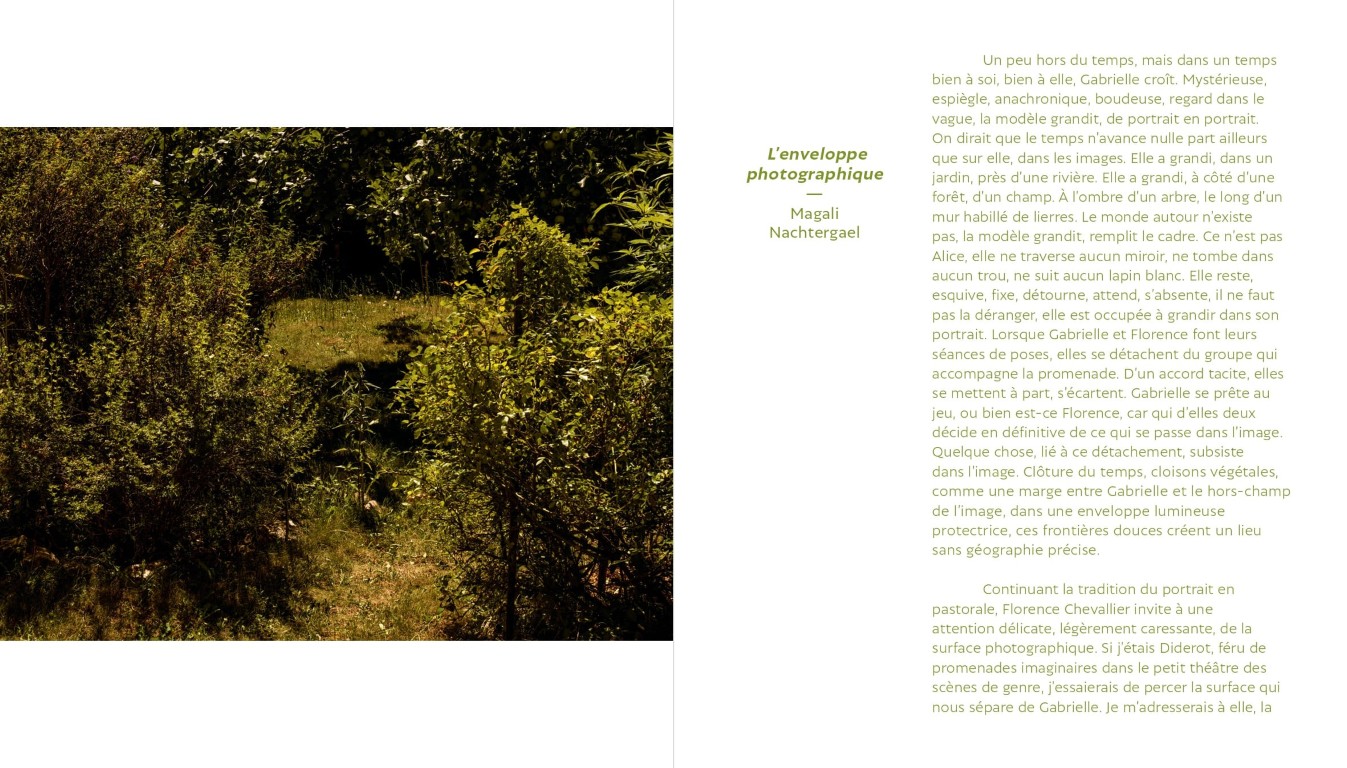 Depuis presque quinze ans maintenant, la photographe Florence Chevallier – prix Niépce 1998 – entretient une relation photographique avec Gabrielle, petite-fille de son mari le peintre André Guenoun. Dans leur maison près d’une rivière, dans les bois et le jardin, la petite fille se prête au jeu du regard, acceptant l’appareil photographique qui marque la distance entre l’artiste et son modèle. De la conscience aiguë à l’oubli de soi, Gabrielle semble nous inviter à saisir l’essence de sa beauté dans le temps, mais aussi celle de la naissance d’un sujet, qui s’affirme face au monde grâce à la relation que la photographe a tissée avec elle.