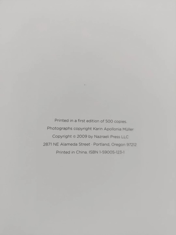 On Edge est la deuxième monographie de Karin Apollonia Müller, et la première à être publiée par Nazraeli Press. Alors que Angels in Fall (2001) traitait de la déconnexion entre les êtres humains et leur environnement, On Edge montre la terre ‘s’effriter’. Ainsi que nos efforts futiles pour contrôler ou cacher l’invasion subtile de la nature dans les espaces cultivés. Travaillant en couleur avec une palette sourde et un faible contraste, Müller crée des images puissantes qui évoquent un sentiment de déplacement en accord avec le « statut de visiteur » de l’artiste en tant qu’étranger à Los Angeles.