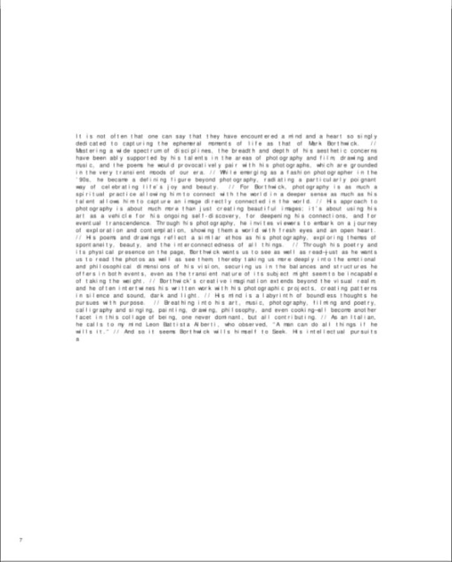 Mark Borthwick creuse profondément dans ses archives de premières œuvres filmées sur le film instantané Polaroid noir et blanc Pola Pan 35 mm. Le jeune photographe expérimental était envoûté par ce medium, qui lui enseignait la fragilité du temps et l’encourageait involontairement à faire confiance aux vertus des erreurs, façonnant son esthétique photographique douce, romantique et rêveuse. Le livre présente sa documentation des rues de Paris et de New York dans les années 1980 et 1990, y compris des portraits de famille et d’amis; les premiers travaux de mode mettant en vedette des modèles emblématiques tels que Kate Moss, Carolyn Murphy, Kristen Owen, et Stella Tennant; collaborations avec des créateurs de mode tels que Maria Cornejo, John Galliano et ses muses telles que Chloe Sevigny, Kim Gordon, Jane Birkin, Marianne Faithfull, Michael Hutchinson et Vanessa Paradis; et ses pochettes d’album emblématiques pour Sinéad O’Connor.