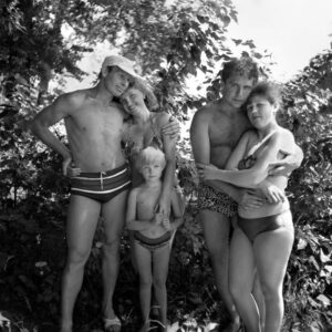 Alors que l’Union soviétique commençait à s’effondrer au début des années 1980, Bakharev se tourna vers le portrait privé. Il a voyagé près des plages de la rivière et du lac, comme Cheryomushk, où les travailleurs et les familles se sont réunis pour se détendre. Ces plages étaient parmi les rares espaces publics en URSS où toute forme de nudité était tolérée. « Presque toute image d’un corps nu était considérée comme de la pornographie, ce qui était contraire à la loi », dit-il. Ici, il a créé une archive profondément humaine de la vie soviétique sans fard : des portraits intimes et non surveillés de personnes dans des moments de tendresse —parents embrassant leurs enfants, couples pressés, amis buvant dans la lumière de l’après-midi.