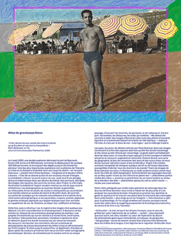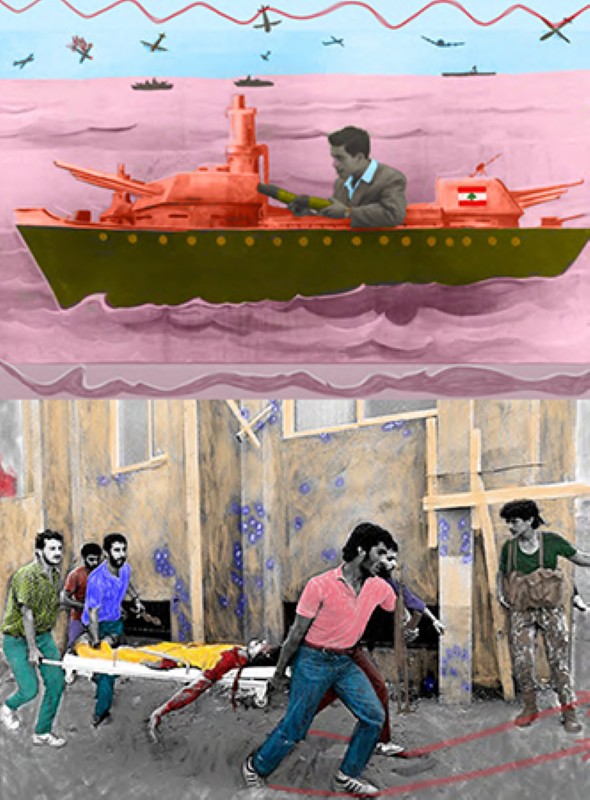 Grâce à la coloration et au photomontage, plusieurs strates temporelles et symboliques s’entrelacent, confrontant la mémoire individuelle et collective. Ce projet souligne la difficulté d’apprivoiser la douleur psychique et met en lumière la dualité des Libanais oscillant entre fierté et autodétestation, face à un pays où la beauté et le chaos coexistent ; texte de Jean-Yves Jouannais.