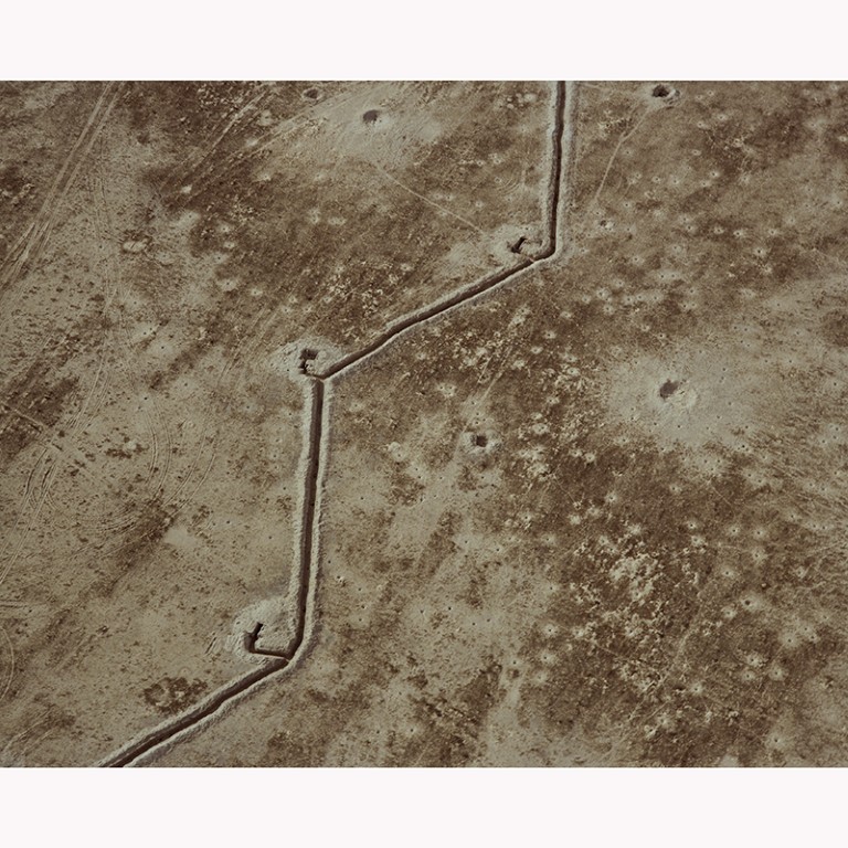 Sophie Ristelhueber’s focus on traces, marks, and subtle remains extends to photographs of buildings, furniture, and bodies. Trenches, bomb craters, and roadblocks appear as wounds in the landscape, while scars and stitches on newly operated bodies become signs of human vulnerability. Worn carpets and wallpaper carry fragments of memory. Even though people rarely appear in her photographs, their presence and actions are always palpable.