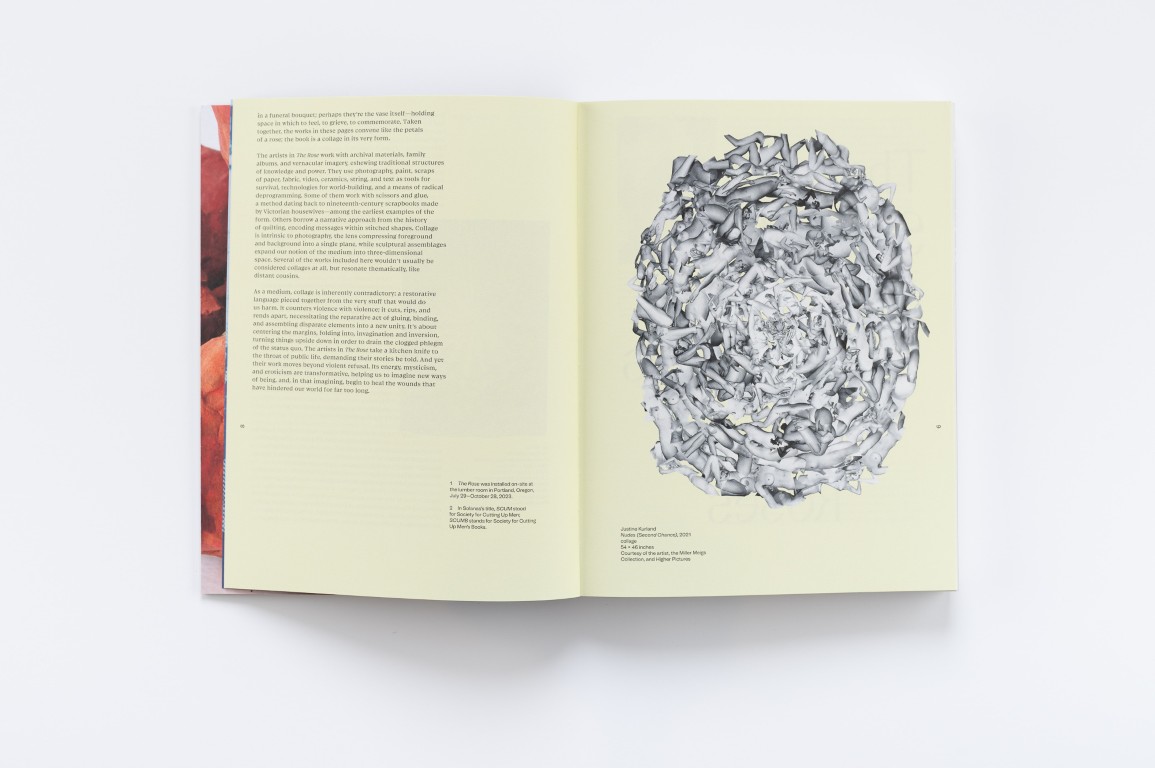 Avec une interprétation large et libre de ce qu’est le collage et de ce qu’il a été, ce livre explore la technique comme un modèle ou une voie pour les artistes afin de re-contextualiser et recadrer tout ce que nous connaissons. Kurland présente un argument selon lequel choisir cette méthode est intrinsèquement politique et en fait contradictoire. Elle nous demande de considérer le collage comme une action : séparer les choses, centrer les marges et forger de nouvelles structures. Kurland propose : « Le collage lutte contre la violence par la violence ; il coupe, déchire et déchirer, nécessitant l’acte réparateur de coller, lier et assembler les choses en une unité nouvelle… Les artistes de The Rose se procurent des matériaux d’archives, des albums de famille et des images vernaculaires, perturbant la structuration du savoir et du pouvoir. Ils utilisent la photographie, la peinture, les morceaux de papier, le tissu, la vidéo, la céramique, la ficelle et le texte comme outils de survie, des technologies pour la construction du monde et un moyen de déprogrammation radicale. » Avec des planches en couleur d’œuvres de chaque artiste ainsi que l’écriture de Kurland contextualisant sa place dans le canon, ce livre sert de re-récit historique de l’histoire de l’art dans le contexte du collage et des artistes à la limite du médium.